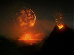 A view of the Moon shortly after its formation, glowing low in the night sky over the volcanically active surface of the early Earth.